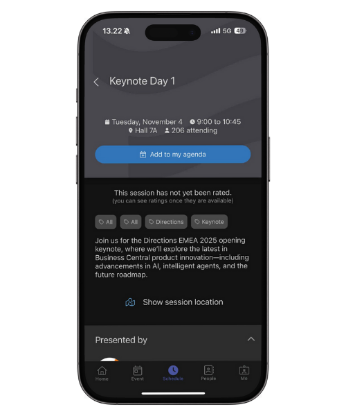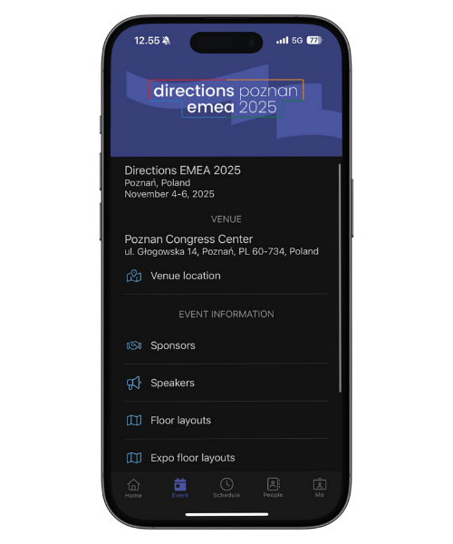 While browsing the event schedule, attendees can also tap on any session to see more details. From there, they’ll find a “Show location on the map” option - making it effortless to locate exactly where the session takes place within the venue.
