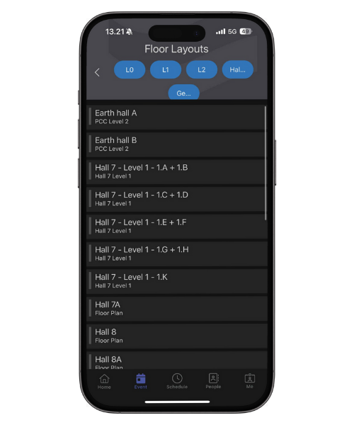 You can see Expo floor layout when you click on the "Event" button in the bottom navigation bar. (Applies only for Directions EMEA)